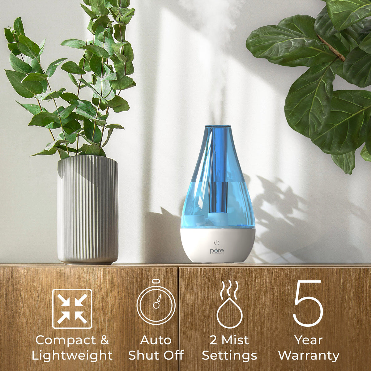 Eliminate dry air from living spaces with the MistAire™ Studio Ultrasonic Cool Mist Humidifier from Pure Enrichment®. The compact size fits easily on any nightstand, desktop, or end table making it perfect for small rooms up to 200 square feet. It even fits inside luggage, making it ideal for travel to moisturize dry hotel rooms. No matter where you decide to use it, the whisper-quiet operation allows you to work or sleep without disturbance with up to 12 hours of run time. Alleviate common symptoms associated with dry air, like cold and sinus issues, as well as providing a welcoming climate to house plants. The MistAire™ Studio Ultrasonic Cool Mist Humidifier is backed by Pure Enrichment’s industry-leading 5-year warranty so your satisfaction is guaranteed.