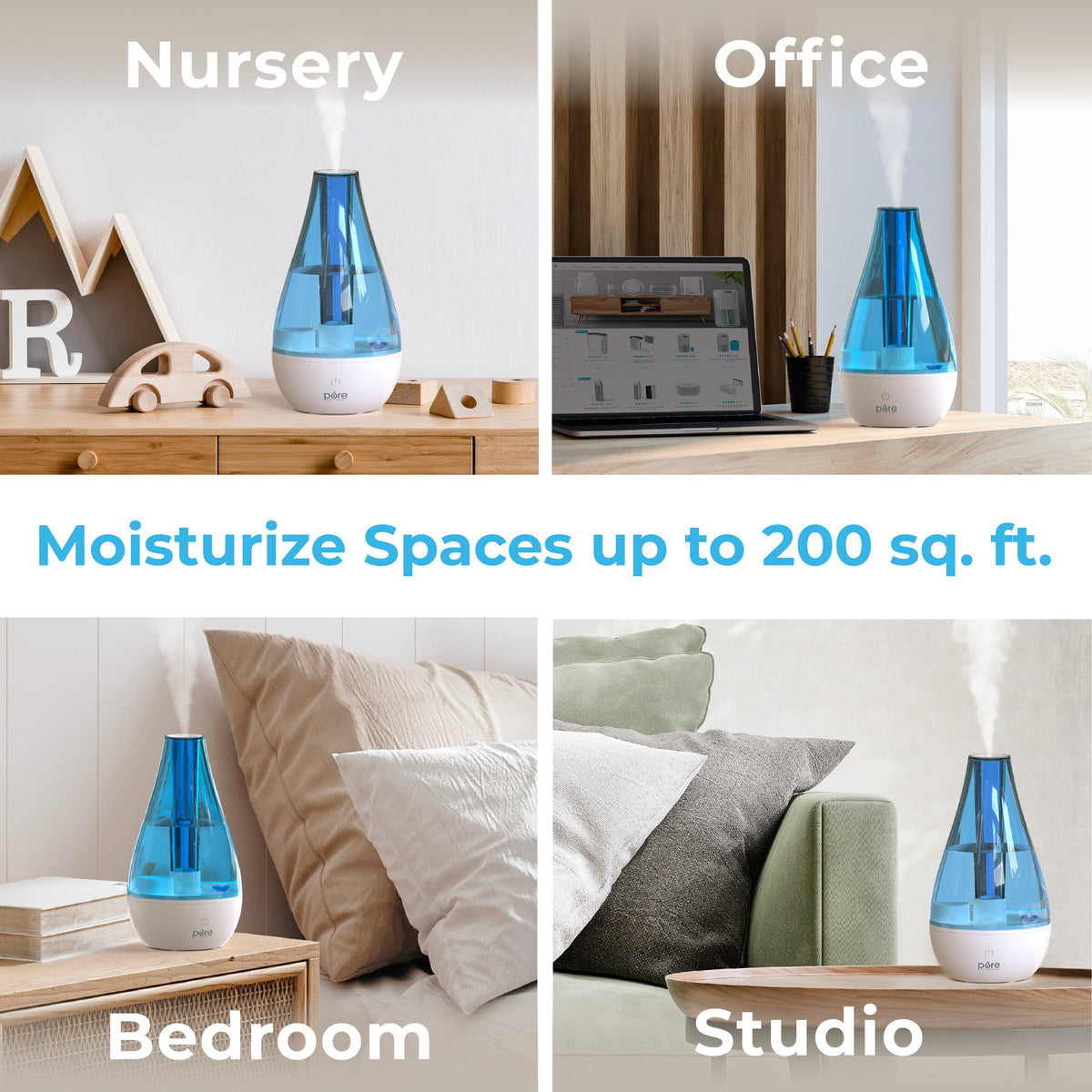 - DRY AIR RELIEF: Breathe better air as the ultrasonic cool mist technology safely and quickly moisturizes dry air for up to 12 hours of continuous operation in small to medium rooms up to 200 square feet. The whisper-quiet mist output with high and low settings makes this humidifier ideal for small spaces like bedrooms, baby nurseries, offices, and even indoor plants.